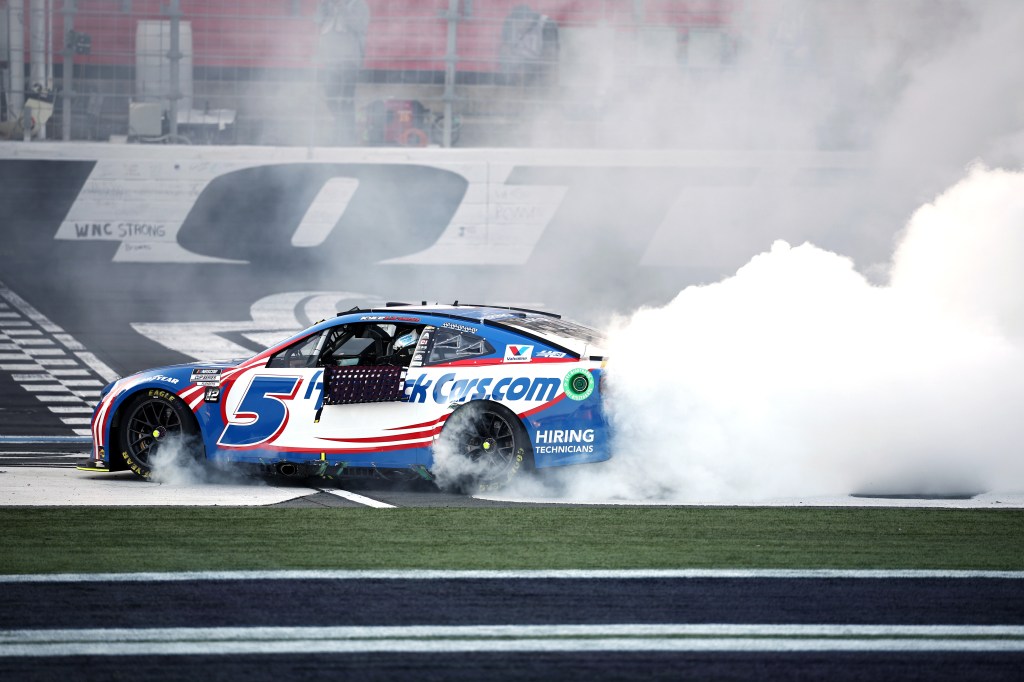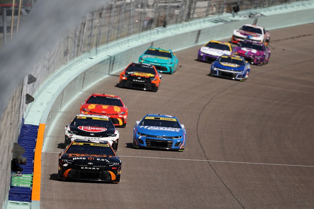 HOMESTEAD, FLORIDA – OCTOBER 27: Tyler Reddick, driver of the #45 The Beast Killer Sunrise Toyota, Christopher Bell, driver of the #20 Rheem Toyota, and Kyle Larson, driver of the #5 HendrickCars.com Chevrolet, race during the NASCAR Cup Series Straight Talk Wireless 400 at Homestead-Miami Speedway on October 27, 2024 in Homestead, Florida. (Photo by James Gilbert/Getty Images)