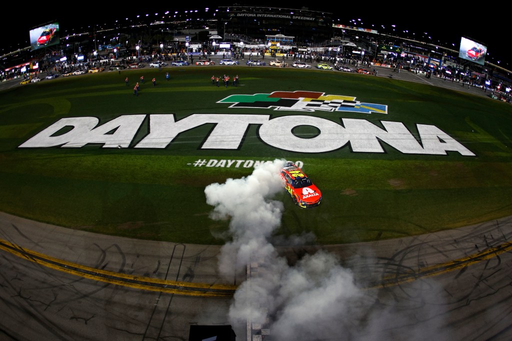 HAMPTON, GEORGIA – FEBRUARY 23: Christopher Bell, driver of the #20 DEWALT Toyota, crosses the finish line to win under caution ahead of Carson Hocevar, driver of the #77 Delaware Life Chevrolet, and Kyle Larson, driver of the #5 HendirickCars.com Chevrolet, in the NASCAR Cup Series Ambetter Health 400 at Atlanta Motor Speedway on February 23, 2025 in Hampton, Georgia. (Photo by Jonathan Bachman/Getty Images)