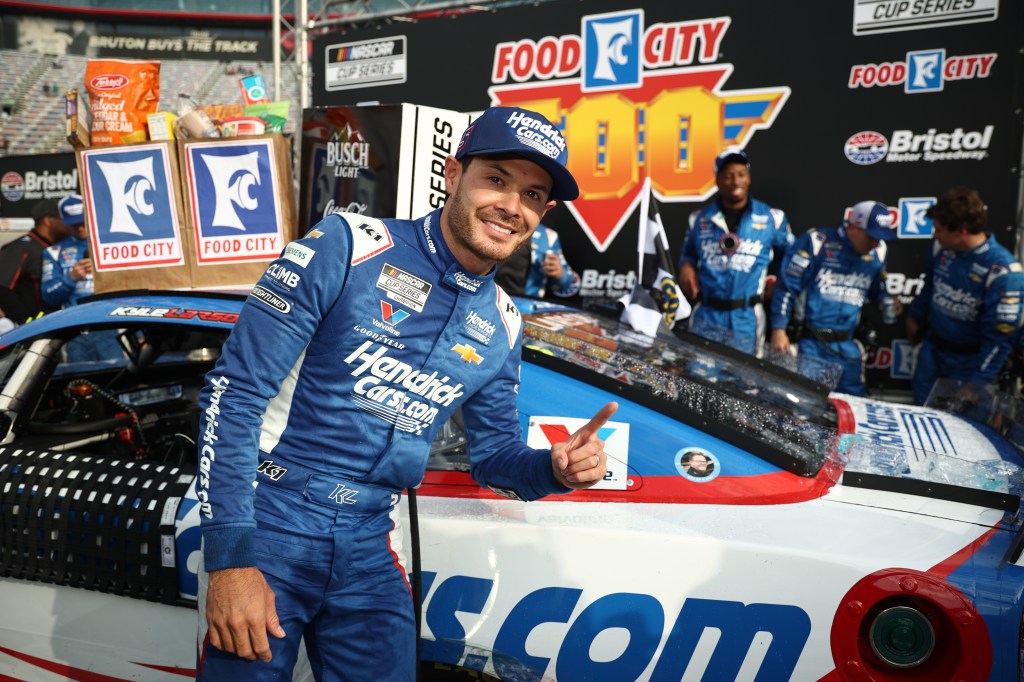 TALLADEGA, ALABAMA – APRIL 27: Austin Cindric, driver of the #2 Menards/Quaker State Ford, takes the checkered flag to win the NASCAR Cup Series Jack Link’s 500 at Talladega Superspeedway on April 27, 2025 in Talladega, Alabama. (Photo by Logan Riely/Getty Images)